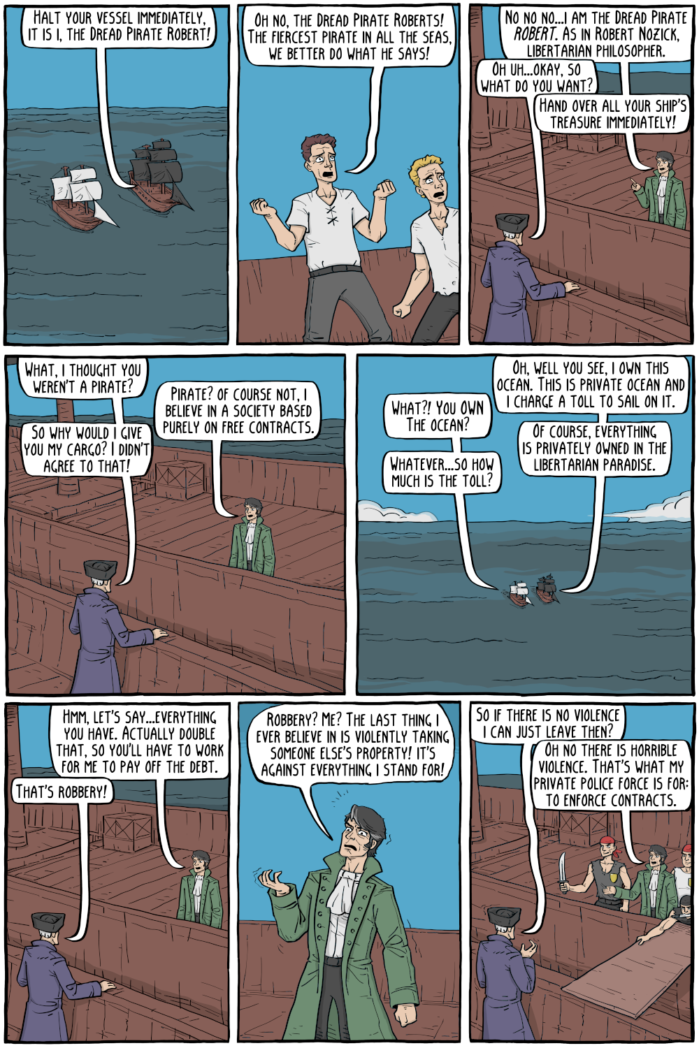 Robert Nozick is a right libertarian philosopher who believe freedom would best be achieved with an extremely limited government whose only real role was enforcing contracts. Free contracts, even between extremely unequal members, were always perfect free, and any property could be maintained as long as it was acquired in an unbroken chain of consensual agreements. Private ownership of things like roads, and even the ocean, was encouraged. So one could expect, for example, that every road was a toll road and there would be no public land at all.